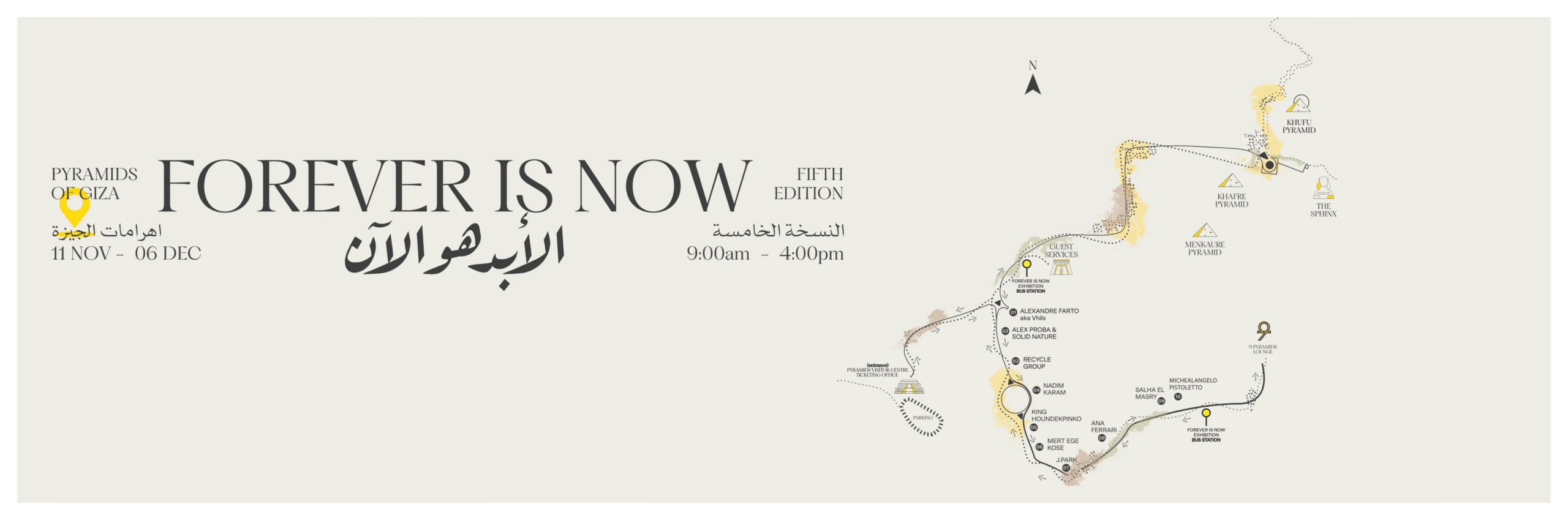 Forever is Now 05 invites viewers to explore the mythic and historical layers of the Giza plateau, allowing contemporary voices to reinterpret the meanings of endurance and legacy. As we walk among these timeless monuments, the exhibition asks: What stories will we leave behind? What truths and myths will define us in the future? In a world constantly transforming, the Pyramids stand as eternal witnesses, challenging us to consider how our present will be woven into the legends of tomorrow.